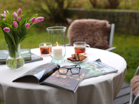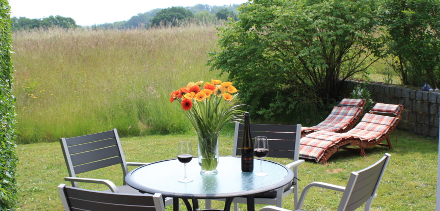 Durch die leichte Hanglage verfügt die Ferienwohnung über eine Terrasse mit kleinem Garten